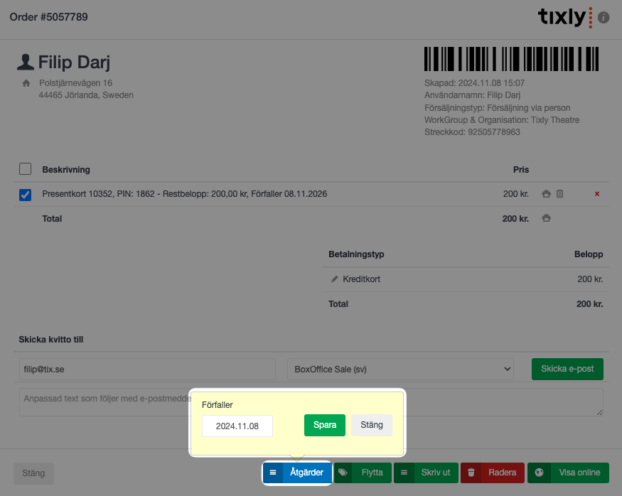 Det är också möjligt att förlänga giltighetstiden på ett sålt presentkort. Markera presentkortet och klicka på Åtgärder - Förläng giltighetstid, ställ in det nya önskade giltighetsdatumet och klicka på Spara. Observera att ni inte får förlänga giltighetstiden om presentkortet har gått ut.