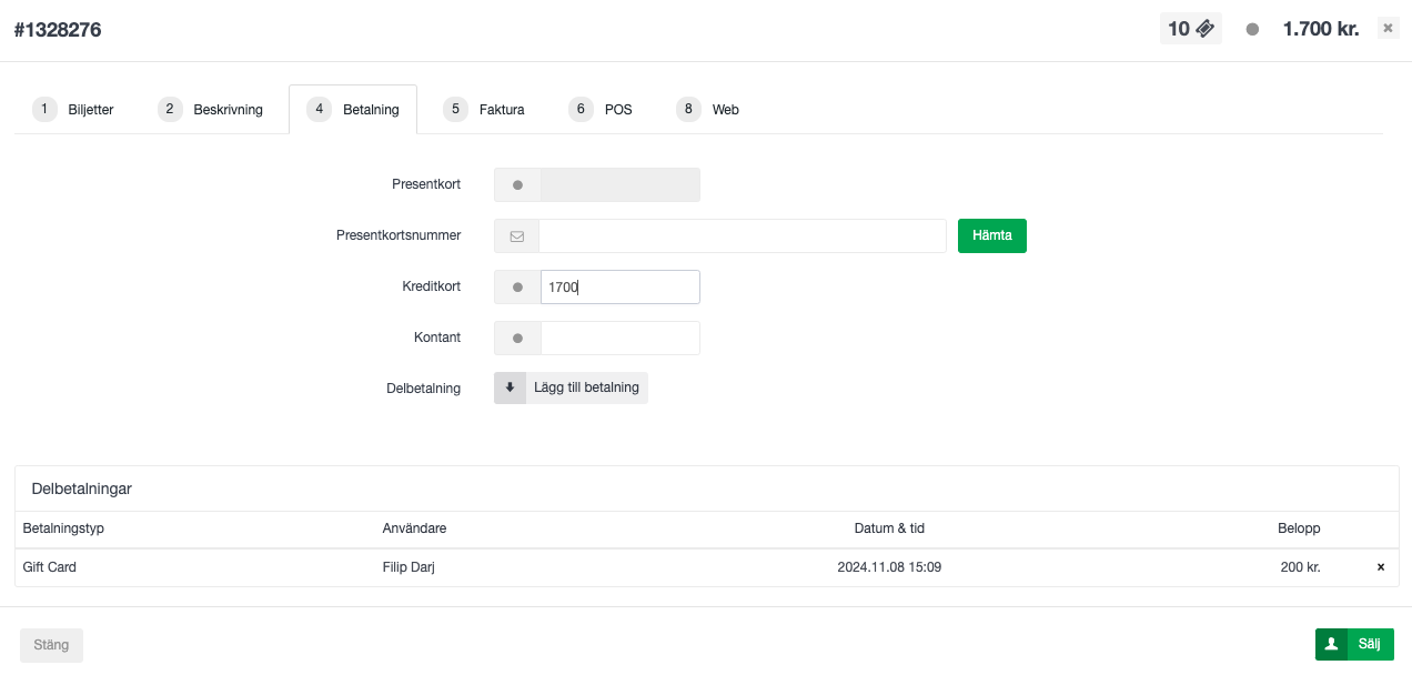 Ett sålt presentkort kan användas som hel eller delbetalning av en order, och flera presentkort kan användas på en och samma order. Ange numret i fältet för presentkortsnummer under betalningsfliken och tryck på Hämta samt Lägg till betalning. Presentkortets värde dras då av från orderbeloppet. Om det finns ett kvarstående belopp att betala kan ett annat betalningssätt användas för att slutföra ordern. Om presentkortet har ett högre värde än orderbeloppet kommer restbeloppet att finnas kvar på presentkortet för framtida användning.