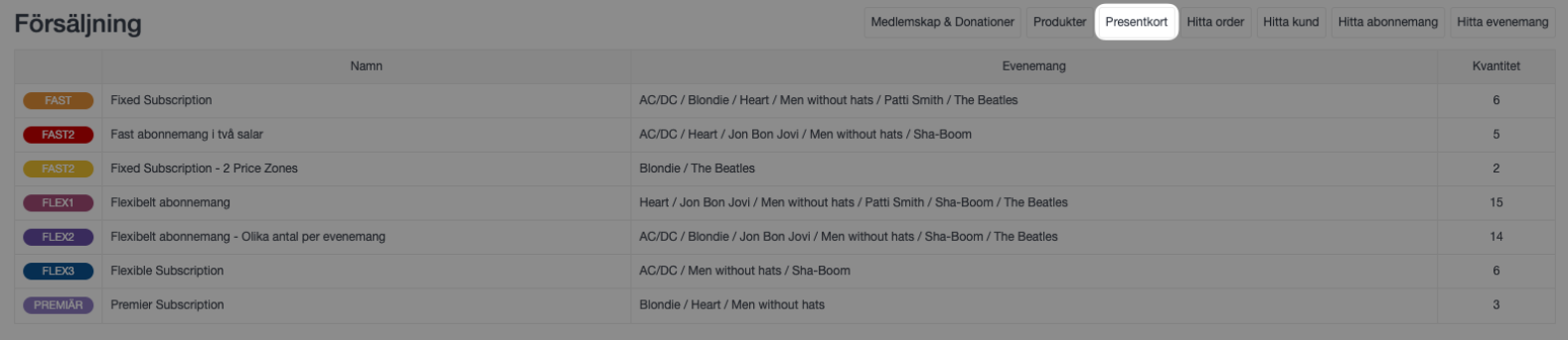 För att sälja ett presentkort navigerar man till Dashboard Försäljning och trycker på knappen Presentkort uppe till höger, alternativt använder kortkommandot ctrl + shift + G.