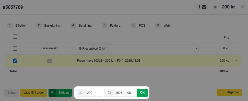 Det är möjligt att ändra giltighetstiden på ett reserverat presentkort när det är kopplat till ett kundkort. För att göra detta markera presentkortet i ordern och en ruta med giltighetstid visas. Fyll i det nya giltighetsdatumet och tryck på OK för att spara.