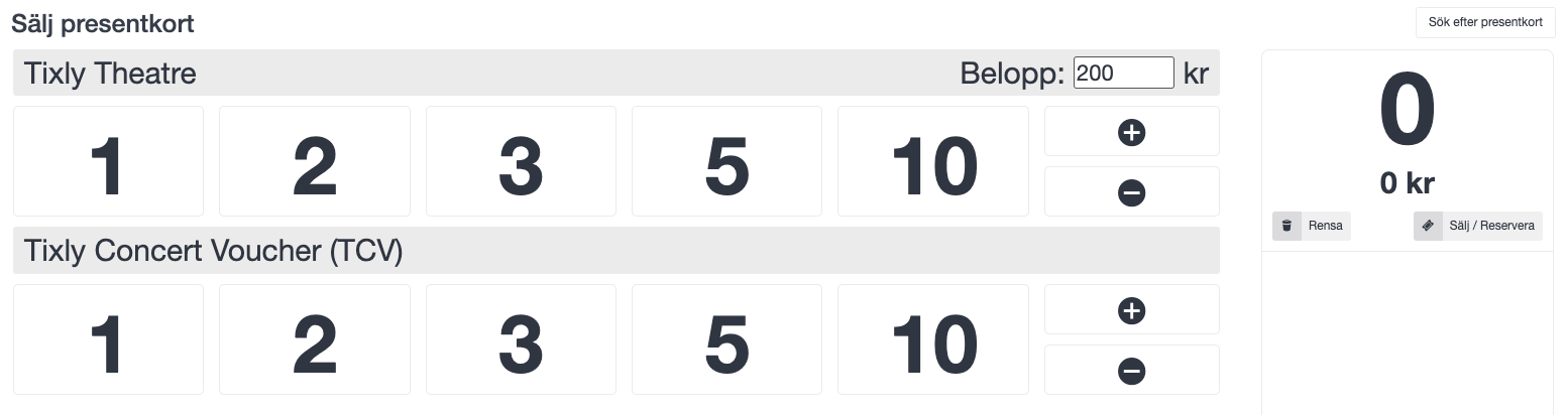 Inne i försäljningsläget anger man först värdet (beloppet) på presentkortet och väljer hur många man vill sälja eller reservera. Tryck sedan på Sälj/Reservera och följ stegen för att lägga till en kund och ta betalt. Presentkort kan också säljas via expressförsäljning där ingen kund kopplas till ordern och utskriften påbörjas direkt efter försäljningen.